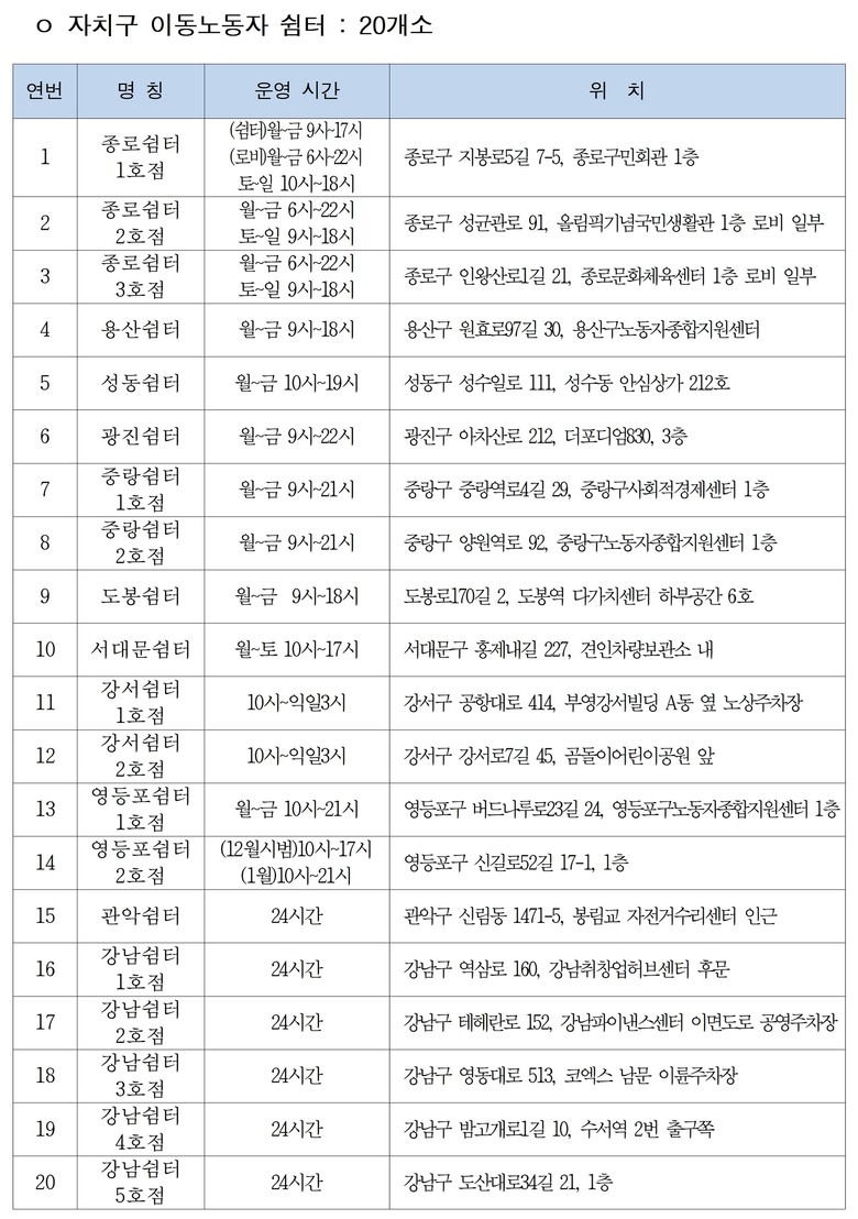 서울시는 이번 새로 조성된 가산쉼터와 구로쉼터를 포함하여 10곳의 이동노동자 쉼터를 운영하고 있으며, 자치구에서는 20곳의 이동노동자 쉼터를 운영 중이다. 서울시 내 총 30곳의 이동노동자 쉼터 위치와 운영시간 등 자세한 정보는 서울노동포털(www.seoullabor.or.kr)에서 확인할 수 있다.
