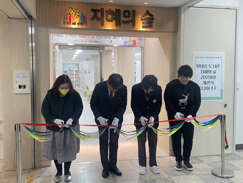[남양주시 세계타임즈=송민수 기자] 별내중학교(교장 이정필)는 3월 19일(화) 도서관 새로고침 사업으로 리모델링을 마친 ‘지혜의 숲’ 도서관의 개관식을 열었다. 이번 리모델링을 통해 학생들에게 보다 쾌적한 독서 환경을 제공하고, 학습과 소통이 이루어지는 공간으로 새롭게 탈바꿈했다.