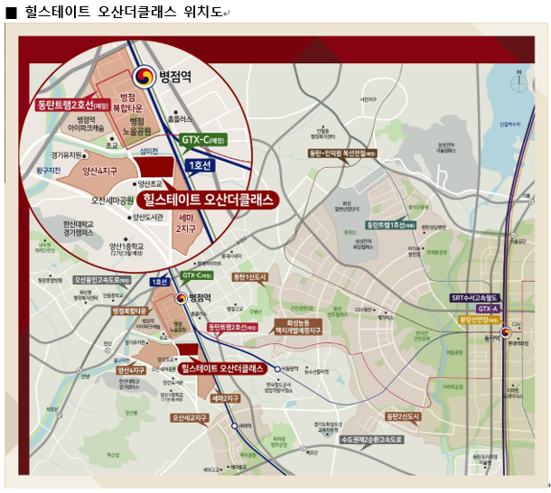 ‘힐스테이트 오산더클래스’는 교통뿐만 아니라 병점복합타운 중심상권 및 홈플러스(병점점), 병점동 중심상권, 동탄1신도시 생활권 등 생활 인프라가 병점역 일원에 잘 갖춰져 있어 편리한 생활이 가능하다.