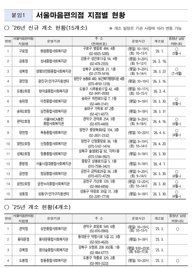 올해 1월 구로점을 시작으로 도봉2호점, 광진점 등 다음 달까지 15개소가 추가로 문을 열면서 4월 말부터는 서울 시내 총 19곳에서 서울마음편의점을 이용할 수 있게 된다. 시는 외로운 시민들의 접근성을 더욱 높이기 위해 연말까지 6개소를 추가할 예정이다.