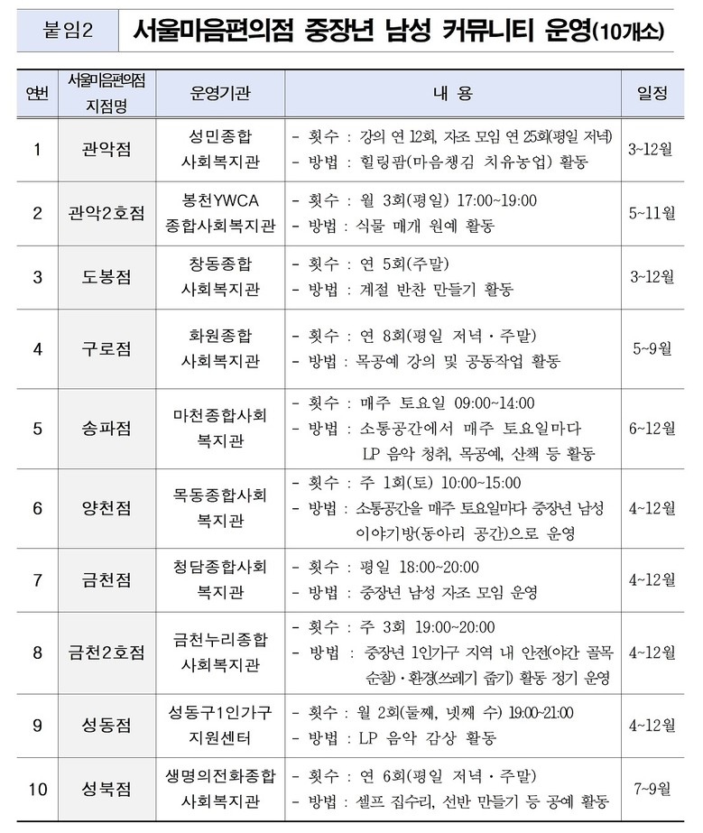 시는 먼저 서울마음편의점 10개소에 ‘중장년 남성 대상’ 커뮤니티 프로그램을 신설한다. 목공예, 원예, 반찬 만들기 등 중장년 남성이 흥미를 갖거나 손쉽게 접근할 수 있는 취미를 기반으로 한 프로그램 운영으로 가벼운 활동과 함께 사회적 관계 형성을 도울 예정이다.