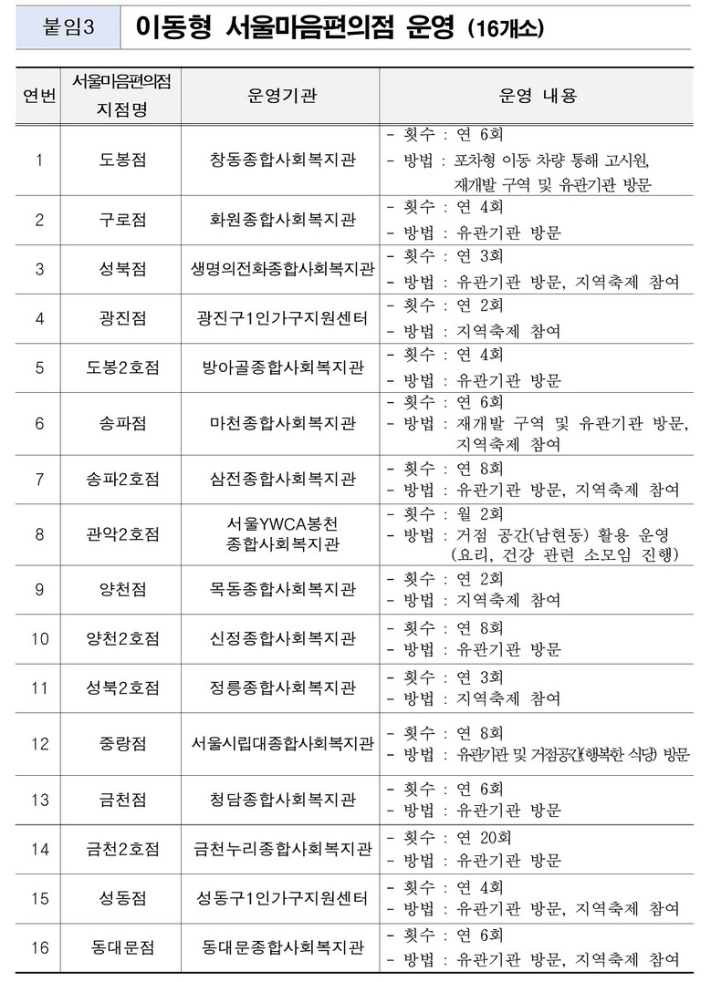 - ‘이동형 서울마음편의점’ 운영, 야간․주말 등 운영시간 확대, 지역별 특화 프로그램도