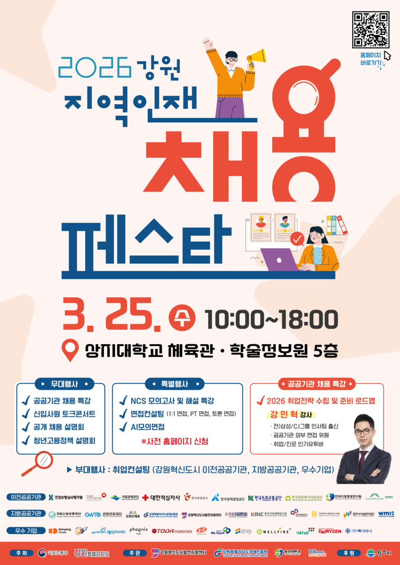 또한, 「2026년 취업전략 수립 및 준비 로드맵」을 주제로 공공기관 채용제도 및 취업전략을 소개하는 공공기관 채용특강(강민혁강사)과 혁신도시 공공기관 신입사원의 취업 준비 과정과 합격 경험을 공유하는 신입사원 토크콘서트 프로그램도 예정되어 있다.