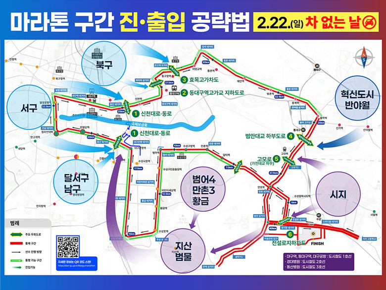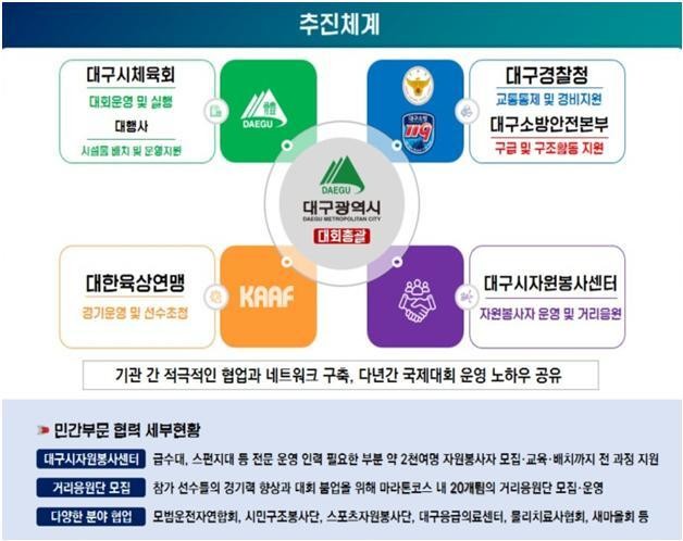 시민 참여 분야에서는 24개 팀 700여 명 규모의 응원단을 주요 지점에 배치하고, 35㎞ 이후 범안로 구간에는 별도 응원단과 디제잉 차량을 운영한다. 또한 대구TV 유튜브 채널 등 다양한 매체를 활용한 집중 홍보를 통해 시민과 함께하는 대회로 운영할 계획이다.