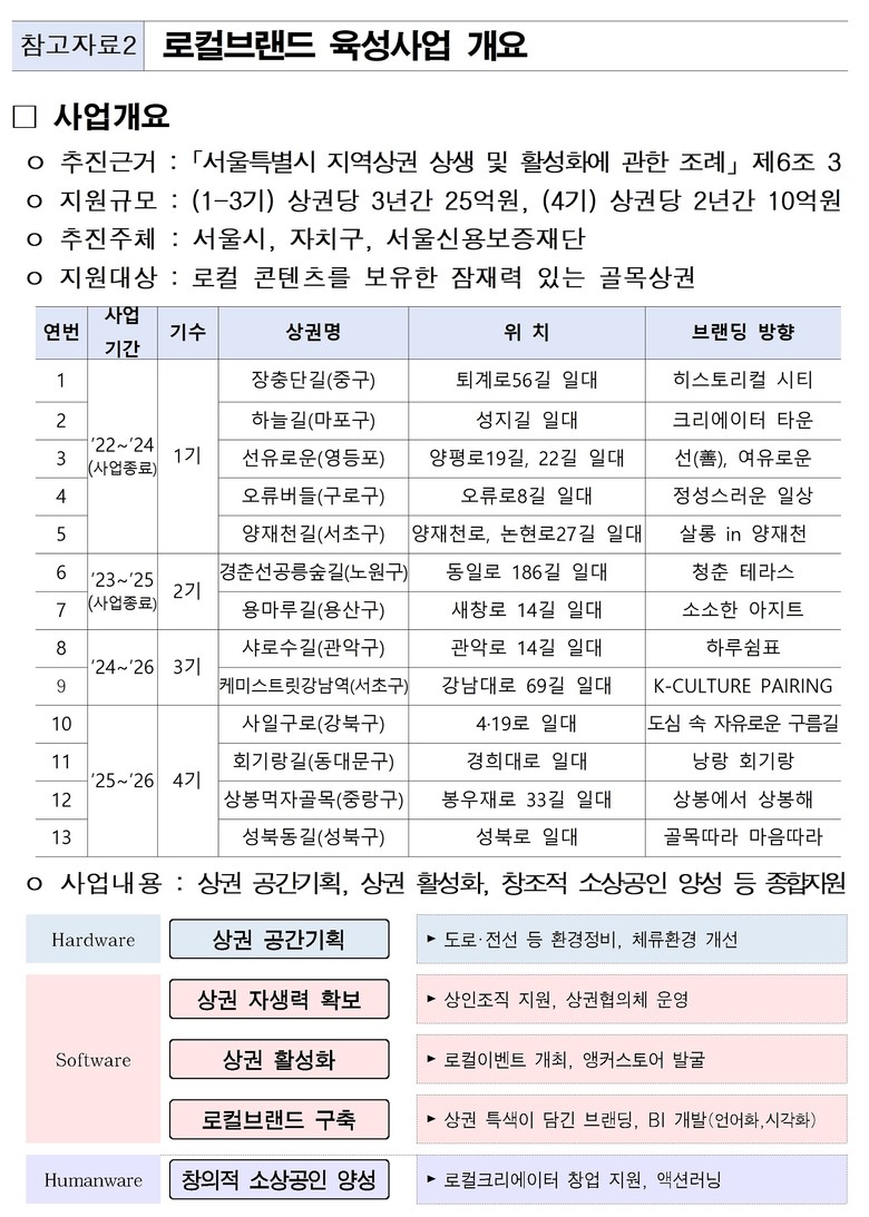 ‘로컬브랜드 육성사업’은 서울시가 2022년부터 추진해 온 골목상권 육성 정책으로, 축제·이벤트 운영, 핵심 점포 육성 등 종합 지원을 통해 상권의 자생력과 경쟁력을 높여왔다.