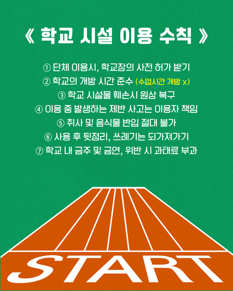 이번 캠페인은 이용수칙 준수, 이용 후 정리, 소음 최소화 등 학교시설 이용문화를 지역사회에 전파하기 위해 마련했다. 이를 통해 학교와 주민은 학교시설을 쾌적하게 활용하고, 동시에 이용자와 학교 간 상호 존중 문화도 강화하려는 방침이다.