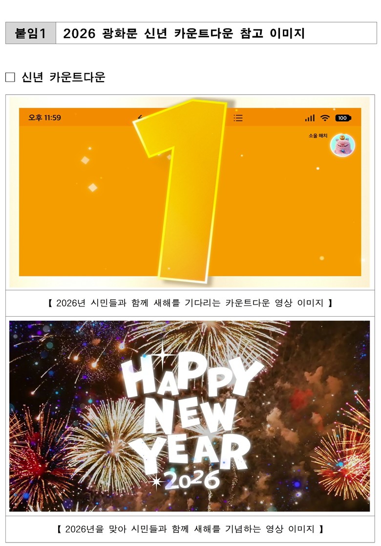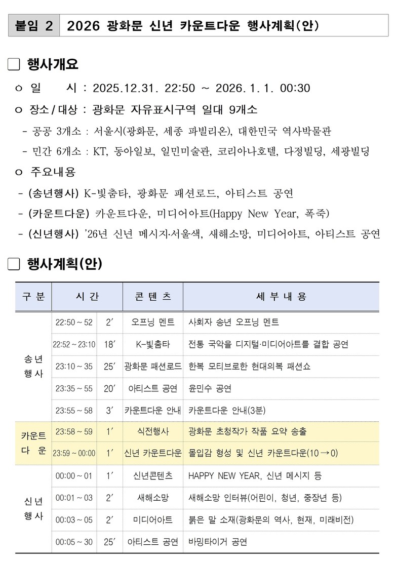 신년 카운트다운 행사는 22시 50분부터 자정 이후 30분까지 이어진다. 행사 전후로는 한국 전통을 살린 광화문 패션로드와 윤민수, 바밍타이거 등 아티스트들의 다채로운 공연으로 현장 분위기를 한층 끌어올릴 예정이다.