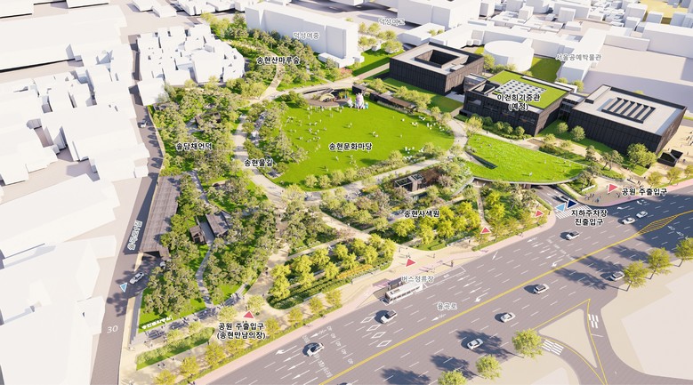 송현문화공원은 주변 공간과의 보행 연계를 체계화해 공원이 도시 맥락 속에 자연스럽게 이어지도록 하고, 건축시설은 공원 외곽으로 배치하고 중심부를 비워 인왕산과 북악산을 조망하는 열린 경관을 구현했다.