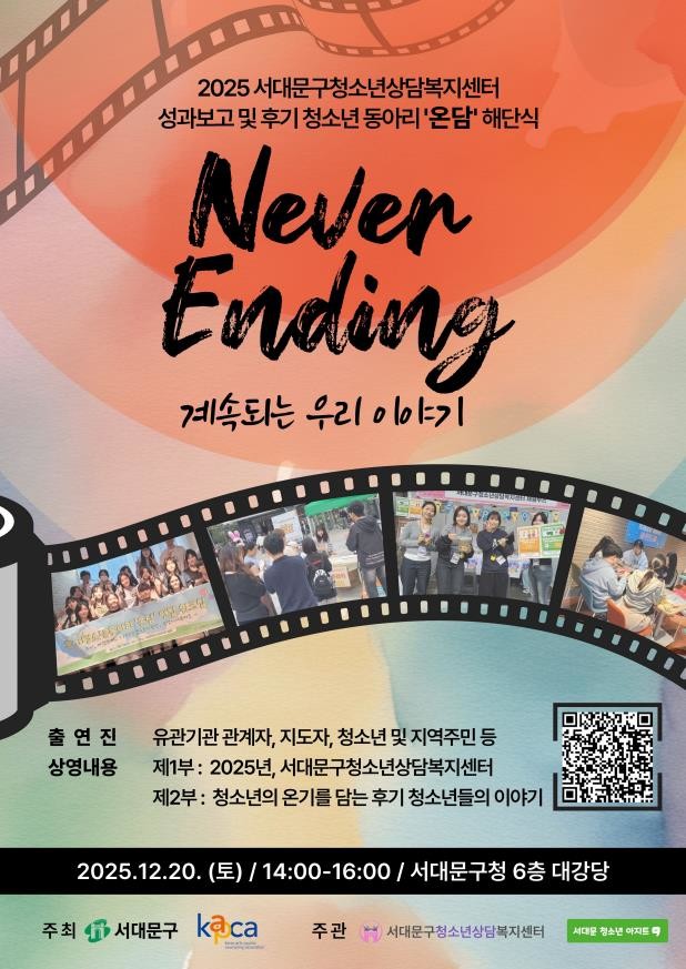 행사에 관한 자세한 내용은 서대문구 청소년상담복지센터 홈페이지 공지사항과 인스타그램(sdm_youth79)에서 확인할 수 있다.
