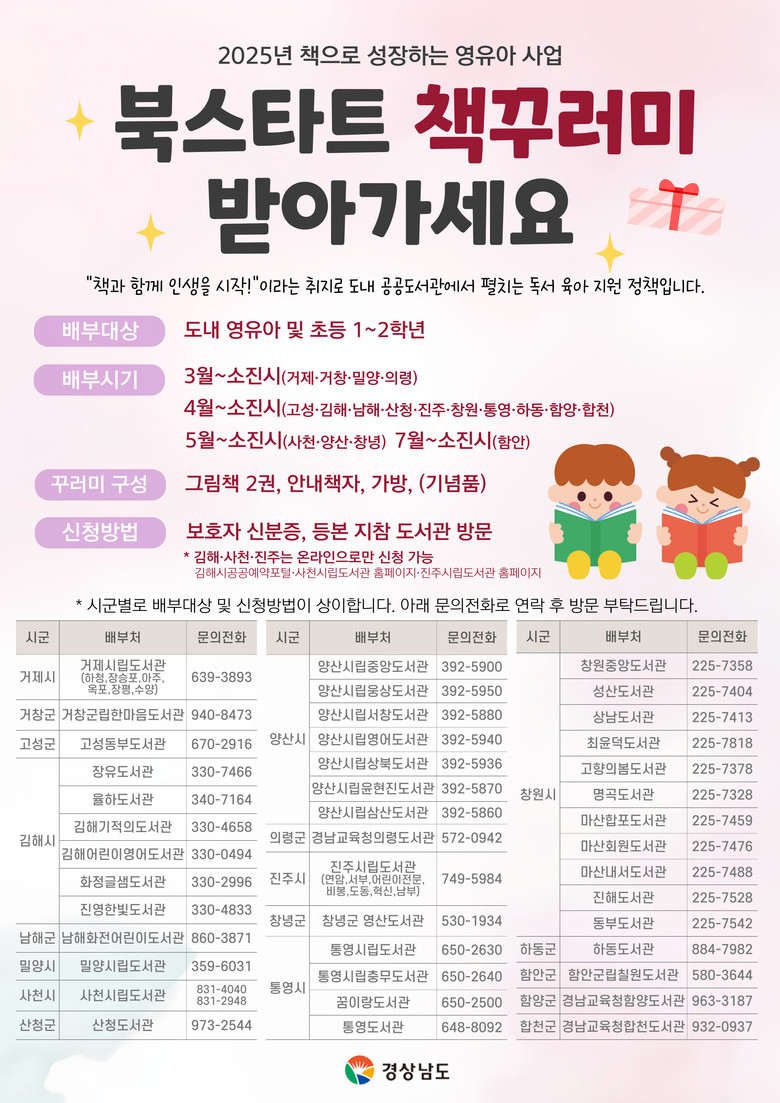 신민철 경남대표도서관장은 “책으로 성장하는 영유아 사업을 통해 아이들의 독서 습관 형성과 부모와 자녀의 정서적 유대감 형성에 도움이 되길 바란다”면서 “많은 도민이 신청하여 독서 문화 혜택을 받으셨으면 한다”라고 말했다.