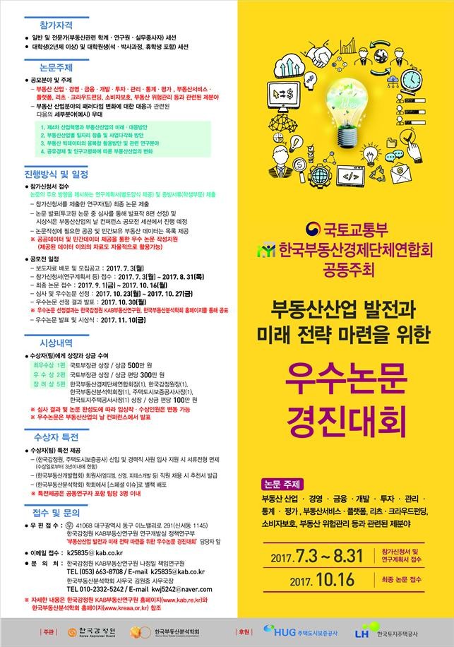 공모 주제는 부동산 산업·경영·금융·개발·투자·관리·통계·평가, 부동산서비스·플랫폼, 리츠·크라우드펀딩, 소비자보호, 위험관리 등 관련된 모든 분야다.