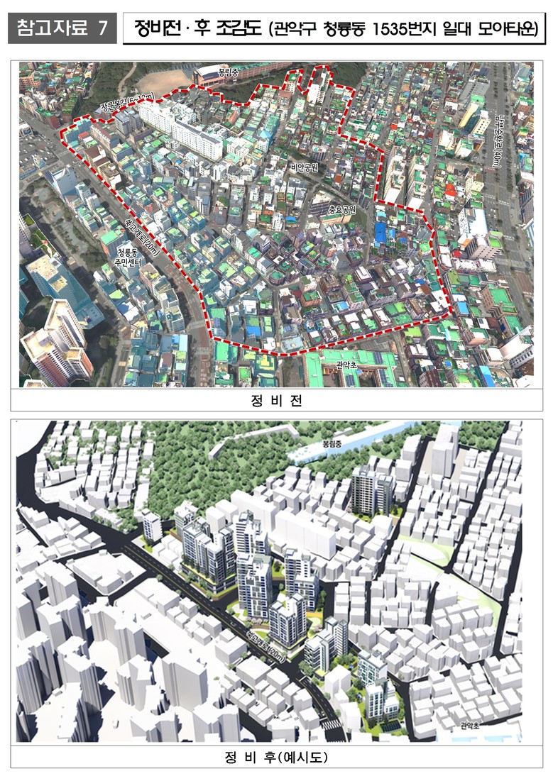 관악구 청룡동 1535번지 일대(92,420.1㎡)는 모아주택 4개소를 통해 총 454세대(임대 64세대 포함)가 공급된다. 분절된 도로체계와 높은 경사로 개발이 어려웠던 지역이나, 이번 모아타운 관리계획으로 체계적인 사업 추진이 가능해졌다.