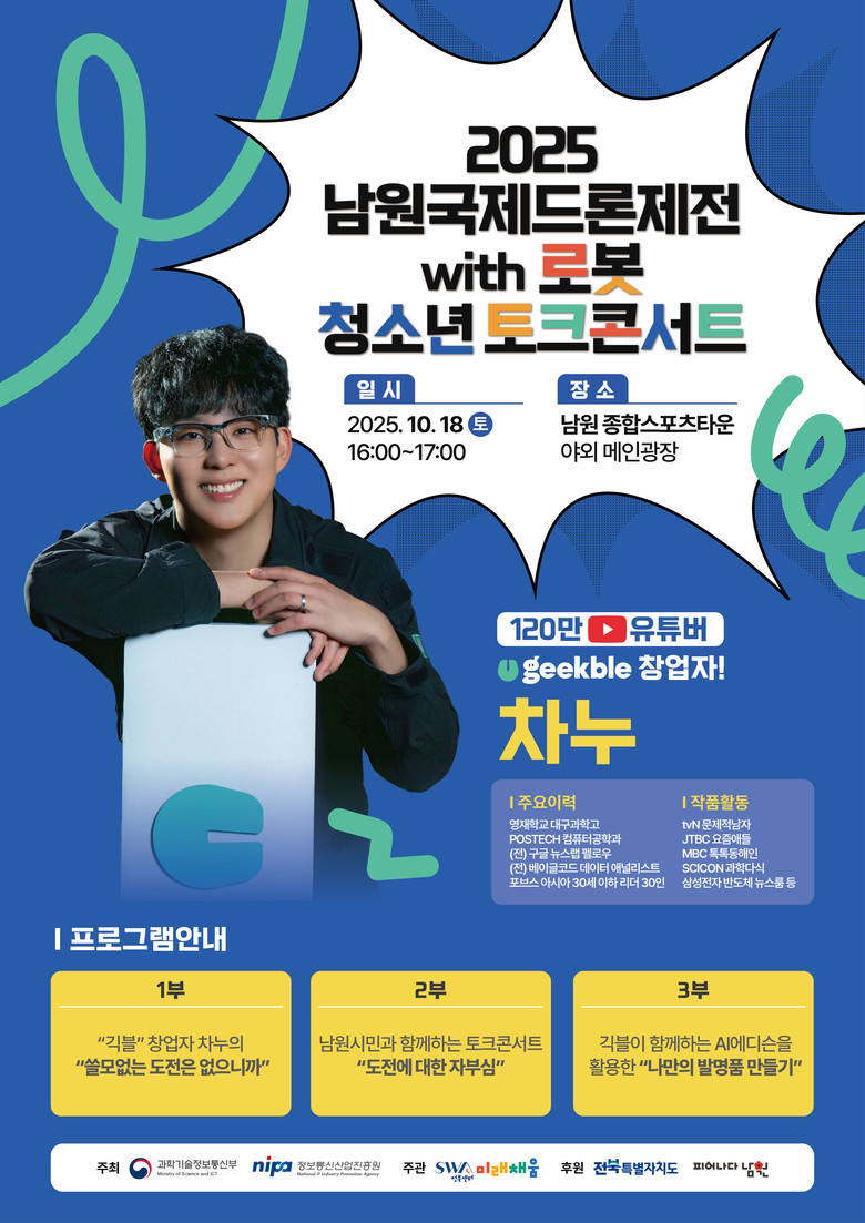 이번 행사는 ‘2025 남원 국제드론제전 with 로봇’과 함께 연계 개최되며, 지역의 미래 기술 교육 활성화와 시민 참여 확대에 중요한 역할을 할 것으로 기대된다.
