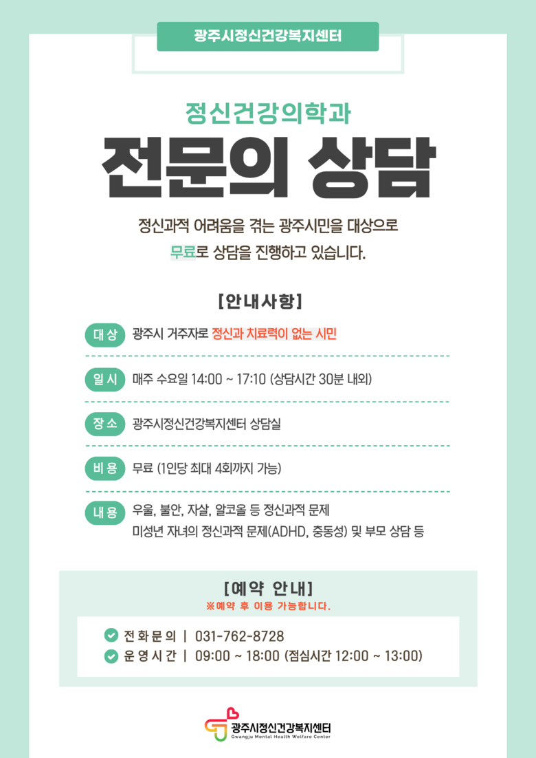 상담은 사전 예약제로 매주 수요일 오후 센터 내 상담실에서 진행되며 광주시에 거주하는 시민이면 누구나 무료로 이용할 수 있다. 정신건강의학과 전문의와의 1대1 심층 상담을 통해 개인의 심리·정서 상태를 평가하고 필요 시 추가 검사와 치료 방향에 대한 조언을 받을 수 있다.