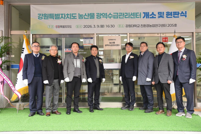 도는 3월 9일(월) 오후 4시 30분 강원대학교(춘천) 친환경농업연구센터에서 김강민 도 농산물유통과장을 비롯해 농협중앙회 강원본부장, 한국농수산식품유통공사(aT) 강원지역본부장, 산지 유통인, 생산자 대표 등 관계자 20여 명이 참석한 가운데 강원특별자치도 「농산물 광역수급관리센터 개소식」을 개최했다.