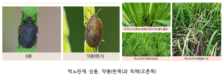 먹노린재는 볏대를 빨아먹으며 생육을 저해하는 해충으로, 논 인근 산기슭에서 월동한 뒤 6월 중순부터 모내기한 논으로 이동, 10월까지 벼를 지속적으로 가해하는 특징을 가진다.