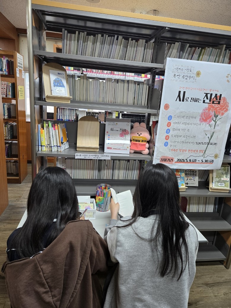 도서부 학생들이 중심이 되어 기획하고 운영하는‘시(詩)로 전하는 진심’은 글숲 소장 시집을 활용하여 감사를 전하는 활동으로, 5월 30일까지 전교생과 전 교직원을 대상으로 진행된다.