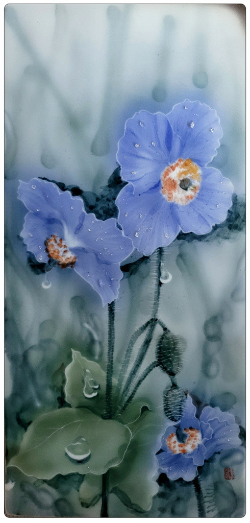 작품명 '연에 맺힌 이슬'은 무더운 여름 더위를 씻겨주며 아름다운 자태를 뽐내듯 피어 있는 연꽃의 매력을 부각시켜 연꽃에서 강한 에너지가 생성되도록 했다. '위안' 작품은 예쁜 양귀비 꽃으로 잠깐이라도 미소를 지을 수 있는 평화로움을 그리고 싶었다. 양귀비 꽃말 위안처럼 따뜻한 속삭임이 느껴지도록 했고, 꽃잎 위에 물방울은 유리를 사용하여 이색적인 표현으로 작품을 완성 하였다. 또한 '연과 물방울' 작품은 이제 막 연잎이 피어나는 어린 잎 위에 물방울이 송골송골 맺힌 표현으로 맑고 깨끗함을 강조해 상쾌한 기분으로 그림을 즐기도록 했다.