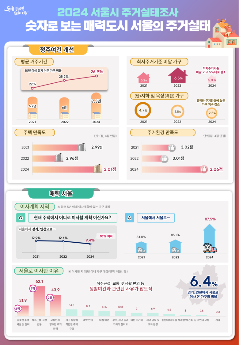이번 조사에서 2021년 대비 서울의 평균 거주기간은 6.2년에서 7.3년으로 증가하며 주거 안정성이 한층 높아진 것으로 나타났다. 최저주거기준 미달가구 비율은 6.2%에서 5.3%로, 반지하 거주가구 비율은 4.7%에서 2.5%로 지속 감소했다.