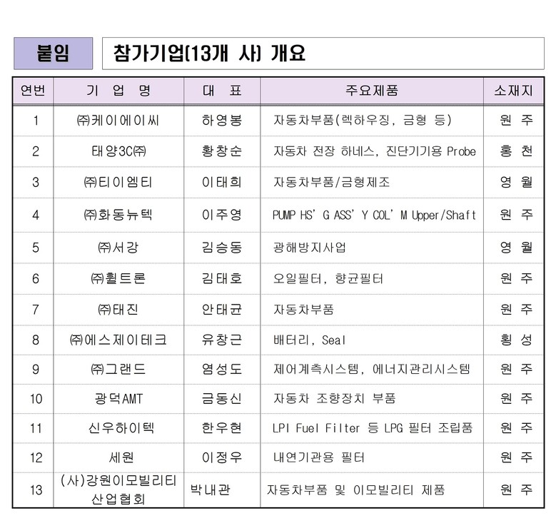 김만호 강원특별자치도 경제국장은 “단기적으로는 전시회 중심의 바이어 발굴에 집중하고, 중장기적으로는 현지 협회 및 기업과의 전략적 제휴를 확대하여 도내 자동차부품 수출기업의 지속가능한 해외 판로 확보에 최선을 다하겠다”고 밝혔다.