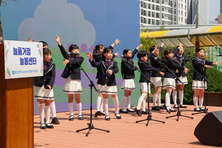 | ▲ 중흥다함께돌봄센터 학생들이 행사 중 동요 합창 축하공연에 참여했다. / 제공 광주광역시교육청 |
