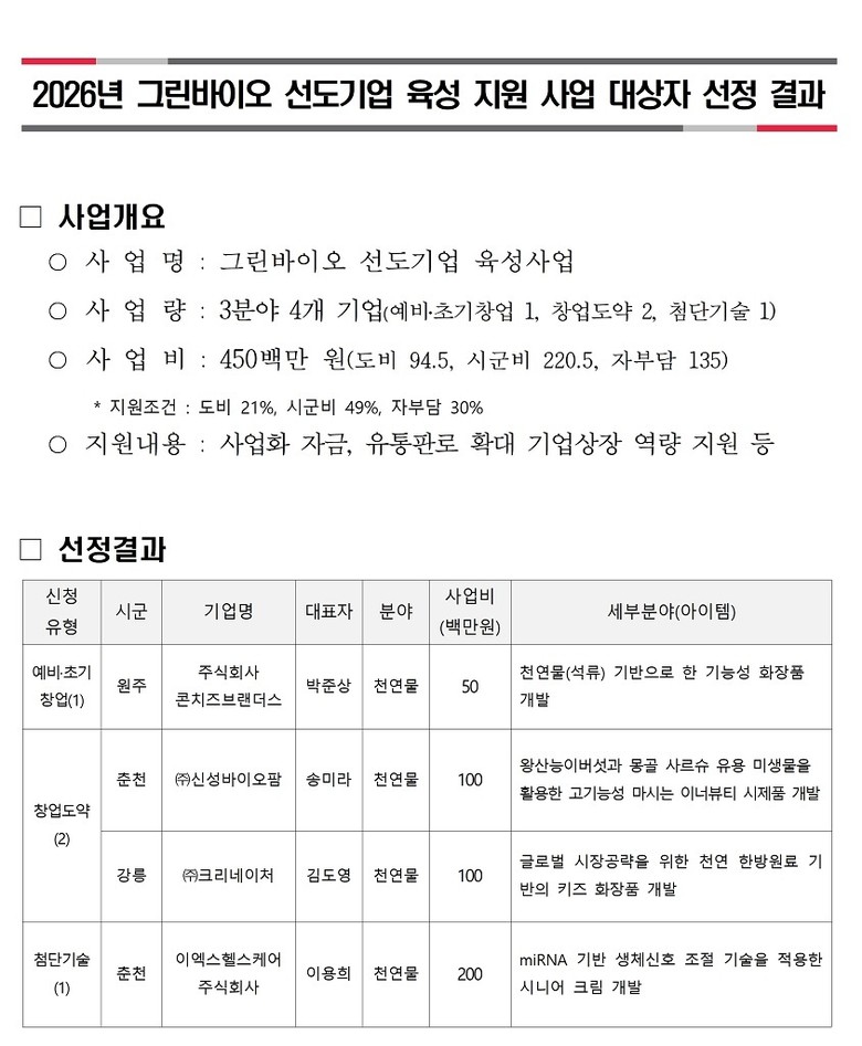 [강원도 세계타임즈=김민석 기자] 강원특별자치도(도지사 김진태)는 바이오 신소재를 개발하고 원재료를 생산하여 기업이 제품화 할 수 있도록 바이오소재 산업과 농업의 선순환 생태계를 구축하는 「2026년 강원 그린바이오 선도기업 육성지원 사업」 대상자 4개 기업을 최종 선정했다.