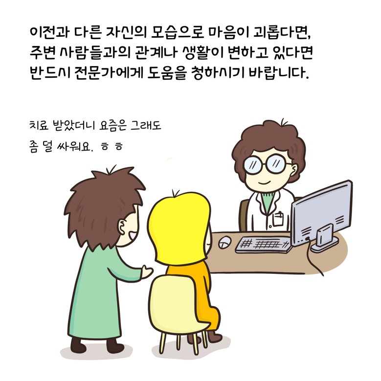 이번 웹툰은 지난 6월부터 제작을 시작해 11~12월에 배포됐으며, 필명 ‘팔호광장’으로 활동하는 장광호 정신과전문의가 참여해 ▲우울증 ▲자살예방 ▲조현병 ▲중독예방 등 총 4화로 구성됐다. 특히 책자에는 웹툰 내용과 함께 정신건강 관련 도움기관 안내와 정신건강복지센터 회원들의 자작 시 작품을 수록해 공감과 치유의 메시지를 담았다.