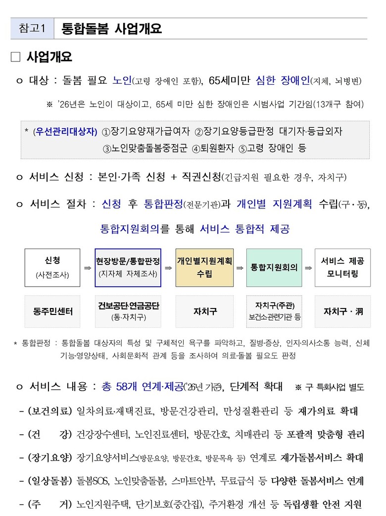 ‘서울형 통합돌봄’은 돌봄 필요 노인(고령 장애인 포함)과 65세 미만 심한 장애인(지체, 뇌병변) 대상 ▴보건의료 ▴건강 ▴장기요양 ▴일상돌봄 ▴주거, 5개 분야 총 58개 서비스를 연계·제공하는 제도로 시는 통합돌봄 비해당 대상자를 예비적 통합돌봄 대상으로 관리하고 6개월마다 모니터링, 필요시 돌봄서비스를 연계할 계획이다.