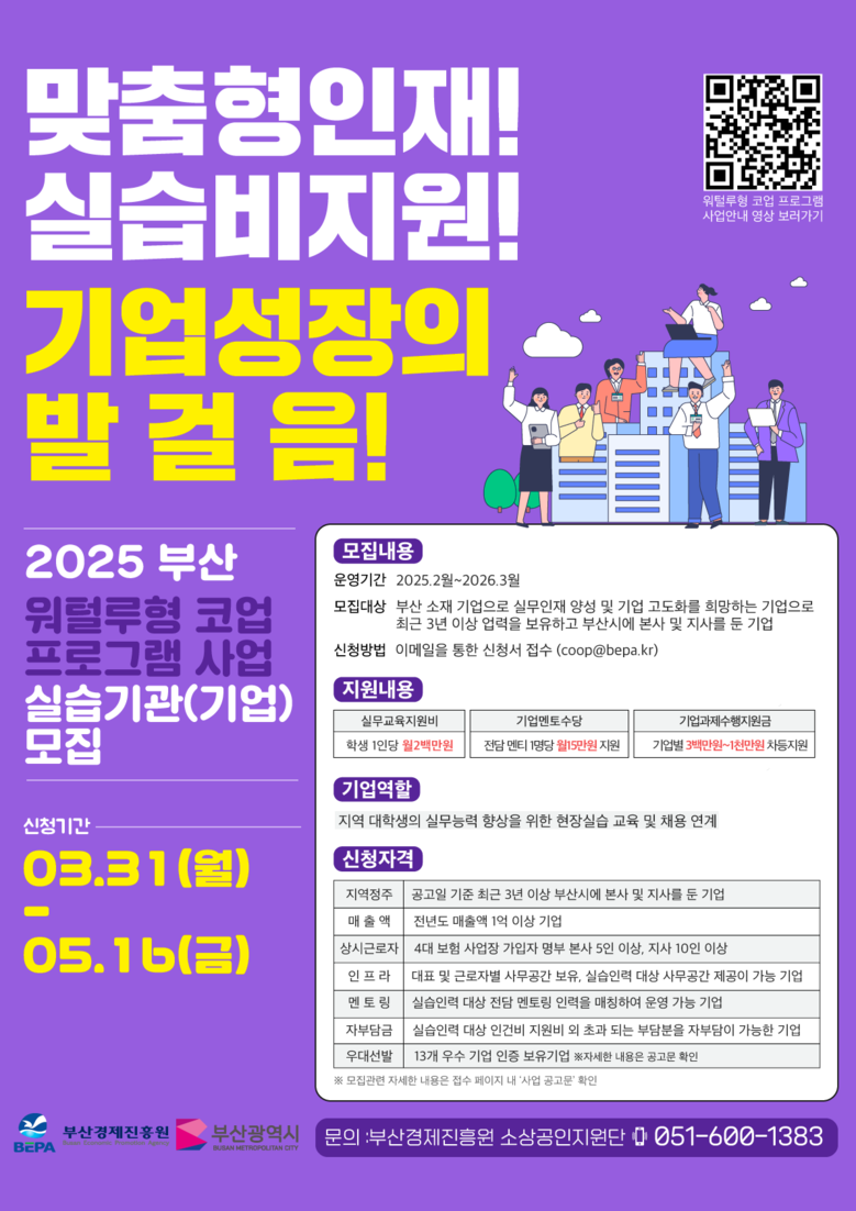 ◈ 프로그램 개편으로 공모 절차를 통해 4개 이상의 운영대학 선정하고 학생과 기업을 연계해, 한 학년 최대 6개월간의 현장실습 지원 [부산 세계타임즈=이용우 기자] 부산시(시장 박형준)는 (재)부산경제진흥원(이하 진흥원)과 실무형 인재 양성을 목표로 대학생 취업 연계와 지역 기업 경쟁력 강화를 지원하는 '2025년 부산 워털루형 코업(Co-Op) 프로그램*'을 개편 운영한다고 밝혔다.
