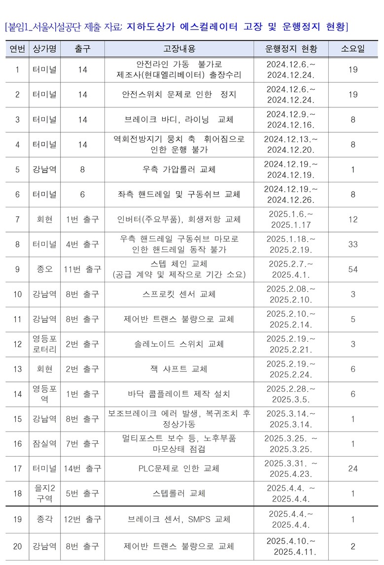 “지하도상가는 지하철과 상권, 환승을 이어주는 생활 이동 통로”라며 “에스컬레이터가 멈추면 단순 불편을 넘어 시민 이동 자체가 차단된다”고 지적했다. 이어 “고장 다발 구간부터 정밀 점검을 실시하고, 사후 수리가 아닌 예방 중심 관리 체계로 전환해야 한다”고 말했다.