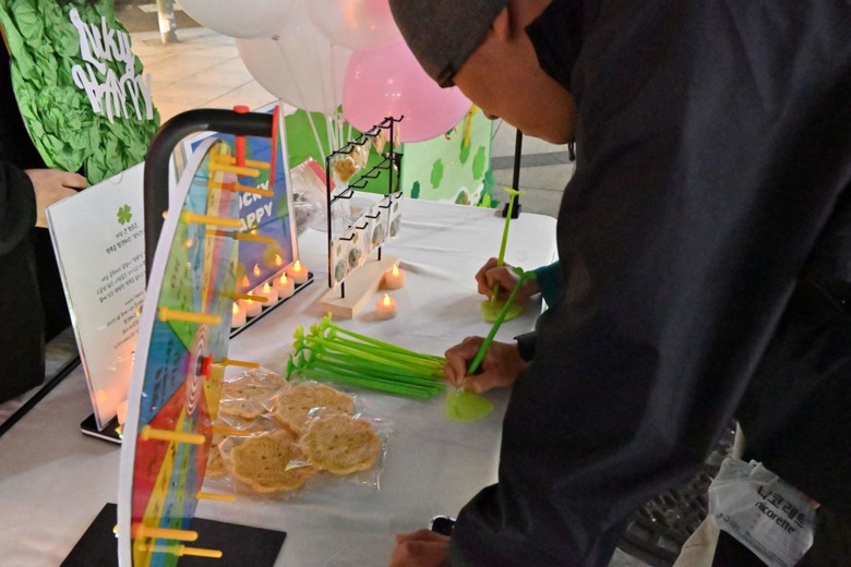 | ▲ 지난 28일 신천지 영등포교회가 진행한 ‘럭키해피’ 캠페인 참여자가 ‘오늘 발견한 나의 행복’ 부스를 이용하고 있다. [사진 제공 = 신천지 영등포교회] |