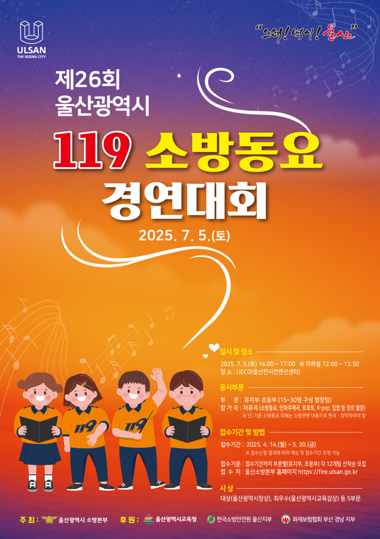 7월 5일 울산전시컨벤션센터(UECO)서 경연대회 개최 [울산 세계타임즈=이호근 기자] 울산소방본부는 오는 5월 30일까지 ‘제26회 울산 119소방동요 경연대회’ 참가팀을 모집한다고 밝혔다.