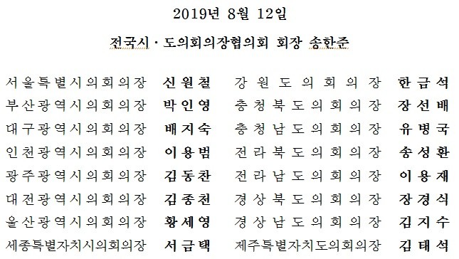 이에 전국 17개 시·도의회 의장들은 국민들이 자발적으로 펼치고 있는 불매운동 등의 각종 활동을 지지하며 국민들과 함께 승리를 쟁취할 것임을 분명히 밝힌다. 또한 피해를 입은 기업들에 대한 지원과 함께 이번 경제침략에 대한 승리만이 아닌 동북아 지역의 평화와 공존을 위한 초석을 만들어 나아갈 것이다.