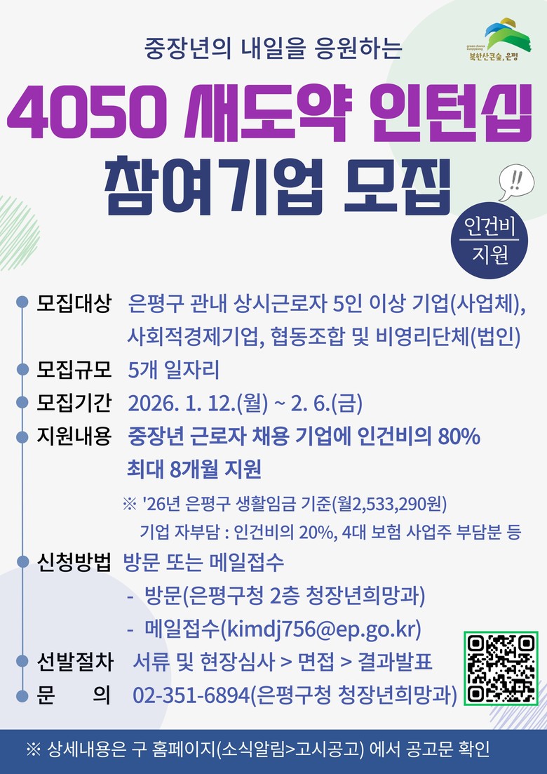 김미경 은평구청장은 “4050 새도약 인턴십 프로그램은 풍부한 경험과 역량을 갖춘 중장년 세대가 다시 일터로 도약할 수 있도록 돕는 사업”이라며 “중장년 인재 채용을 희망하는 관내 기업의 적극적인 참여로 지역 고용 안정과 상생의 일자리 환경을 만들어 가겠다”고 말했다.