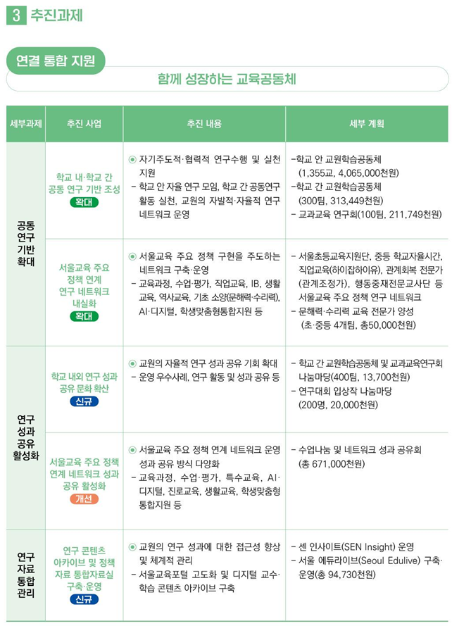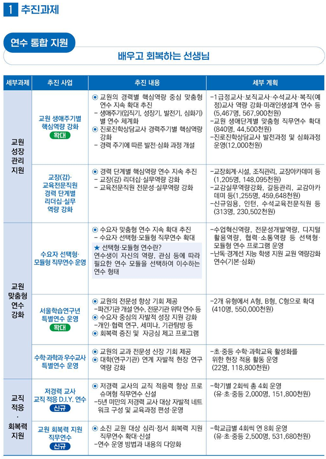 - 교원의 자발적 성장과 연구 실천 지원을 위한 ▲연구 수행 단계별 역량 강화 연수 ▲우수 연구교사 멘토링 운영 등 현장 중심의 자율 실천 연구 기반을 조성한다.