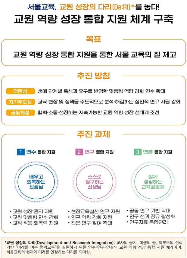 ‘교원 성장의 다리(Da:RI, Development and Research Integration)’는 연수(배우고 회복하는 선생님), 연구(스스로 탐구하는 선생님), 연결(함께 성장하는 교육공동체)의 통합 지원 체계 구축을 상징하며, 서울교육의 현재와 미래를 연결하는 다리(Bridge)를 의미한다. 구체적인 내용은 다음과 같다.