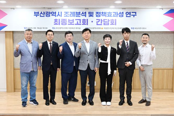 [부산 세계타임즈=이용우 기자] 부산시의회 의원연구단체 '부산조례연구회'(대표 서지연 의원)가 9월 19일(금) 오전 10시 30분 부산시의회 의원회관 회의실에서 『부산광역시 조례분석 및 정책 효과성 연구』 최종보고회를 개최했다.
