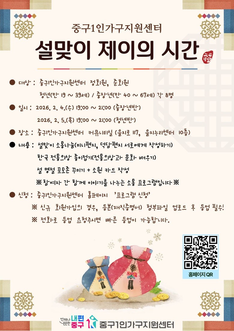 ㅇ 1인가구가 이웃과 함께 명절의 정을 나누는 화합의 장이 될 것으로 기대 [중구 세계타임즈=이장성 기자] 서울 중구는 설 명절을 앞두고 오는 4일부터 14일까지 중구1인가구지원센터(이하 ‘센터’)에서 ‘설맞이 특별 프로그램’을 운영한다.