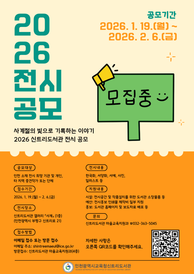 선정 작품은 신트리도서관 1층 갤러리 ‘사계’에서 장르별 1개월 내외로 전시하며, 전시 홍보를 위한 인쇄물 제작은 물론 대외 홍보도 지원할 예정이다.