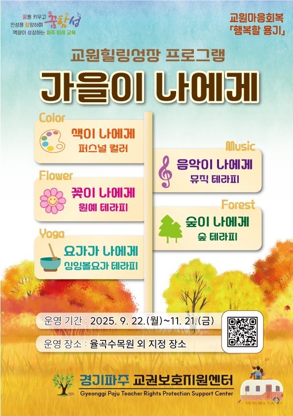 [파주시 세계타임즈=송민수 기자] 경기도파주교육지원청(교육장 전선아)은 10월 1일(수)부터 12월까지 관내 교원의 정서 회복과 마음 돌봄을 목표로 「가을이 나에게 교원 힐링 성장프로그램」을 운영하고 있다.