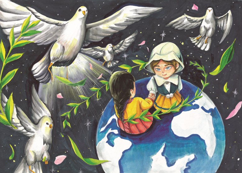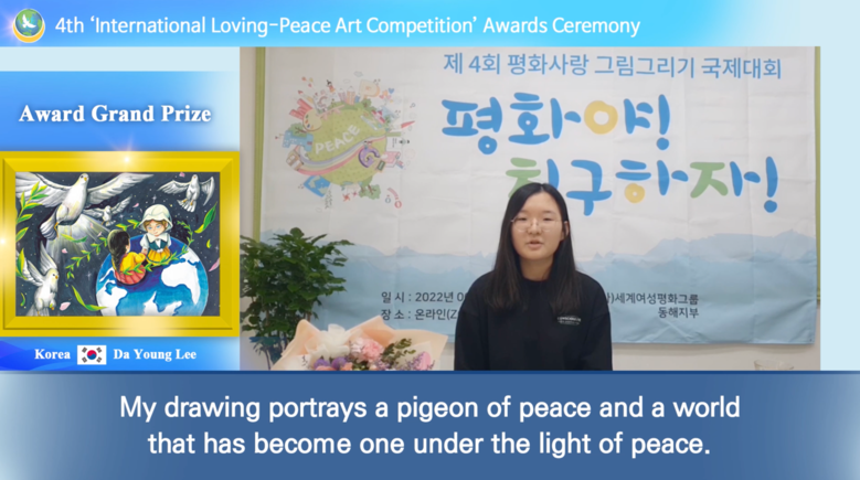 이번 공모전 대상에는 이다영(Lee Da Yeong, 대한민국 동해, 13세) 학생의 ‘우리를 향한 평화의 바람’ 작품이 수상의 영예를 안았다. 이다영 학생은 “손을 잡고 있는 두 친구처럼 각국이 서로 전쟁하지 않고 친구처럼 사이좋게 지낼 수 있는 진정한 평화가 이루어졌으면 좋겠다”면서 그림을 설명했다. 대상 작품에 대해 심사위원들은 “인종차별 없는 지구촌에 자유와 평화의 메시지가 뚜렷이 표현됐다”라는 평가를 했다. 대상에게는 상장과 함께 장학금 100만 원이 전달됐다.