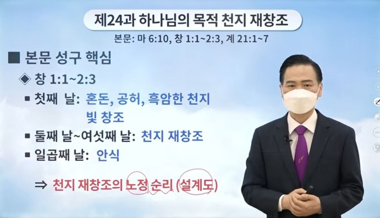 | ▲신천지예수교 도마지파 정읍교회 이용우 담임강사가 중등세미나 24과 '하나님의 목적 천지 재창조'를 주제로 강의를 진행하고 있다. |