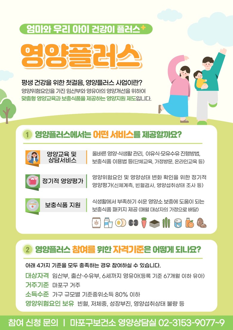 신청 대상은 마포구에 거주하는 임산부와 등록 기준 67개월 이하 영유아로, 가구 규모별 기준 중위소득 80% 이하이면서 빈혈, 성장부진, 영양섭취상태 불량 등 영양 위험요인이 확인된 경우 선정 절차를 거쳐 참여할 수 있다.