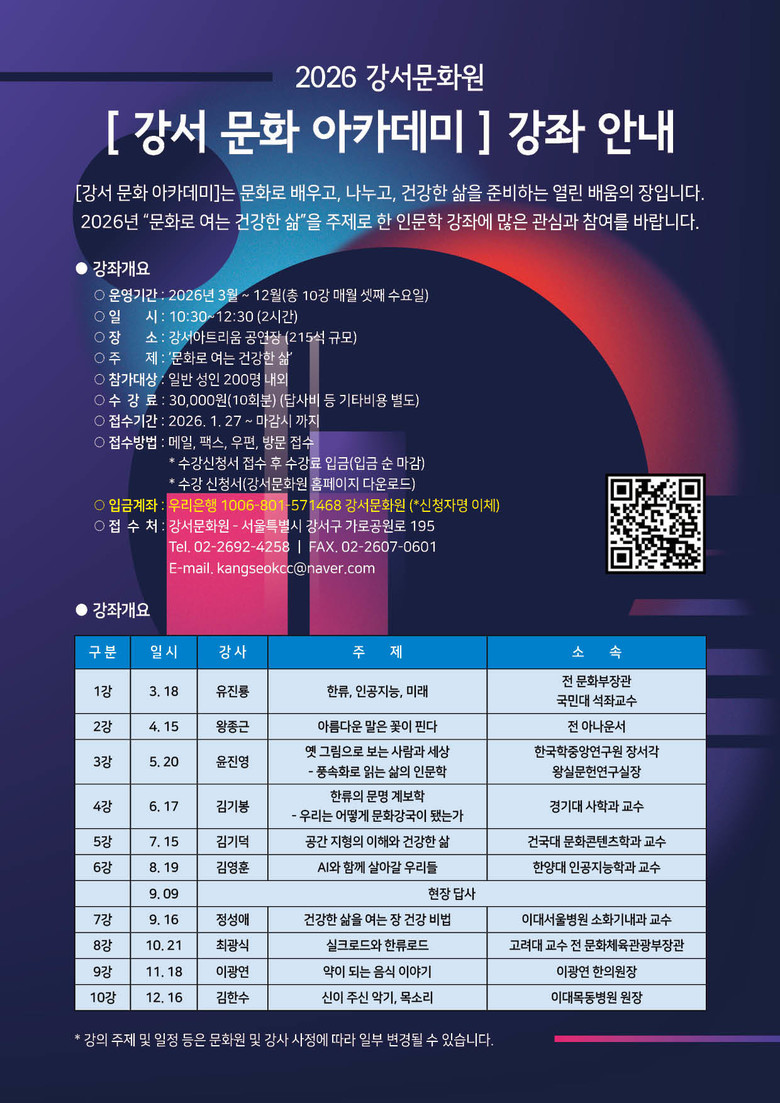 이번 아카데미는 ‘문화로 여는 건강한 삶’을 주제로, 한류, 인공지능(AI), 역사, 건강 등 현대인들에게 실질적 도움이 되는 다양한 주제로 구성된다.