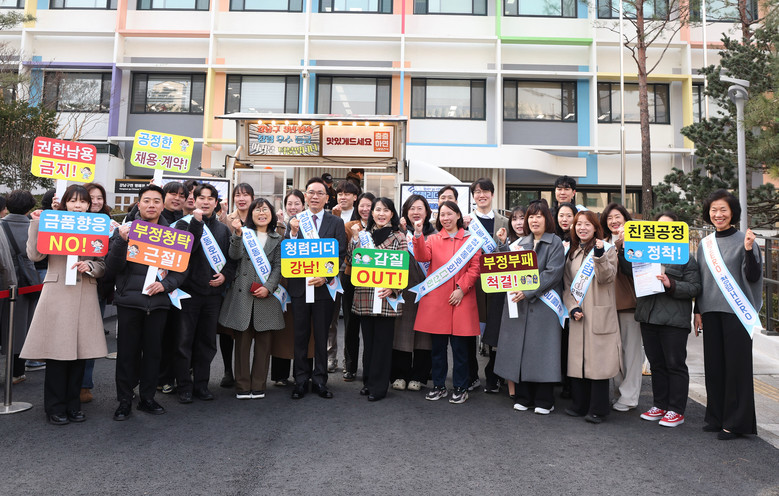 [강남구 세계타임즈=이장성 기자] 꿈이 모이는 도시, 미래를 그리는 강남구(구청장 조성명)가 3월 11일 구청에서 ‘여러분 덕분입니다’ 청렴캠페인을 진행했다. 2025년 공공기관 종합청렴도 평가에서 3년 연속 청렴 우수등급을 달성한 것을 기념하고, 반부패·청렴 실천 의지를 다시 다지기 위해 마련한 행사다.