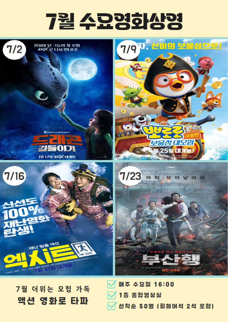 도서관은 오는 7월 한 달간 매주 수요일 오후 3시 30분, 1층 종합영상실에서 ‘수요영화 상영회’를 개최한다고 밝혔다.