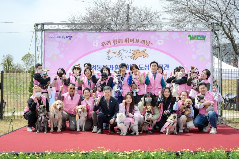 | ▲ 지난해 3월 반려동물실외놀이터에서 열린 순천시 반려견봉사단 ‘순댕이’ 위촉식에서 단체 기념촬영을 하고 있다 |