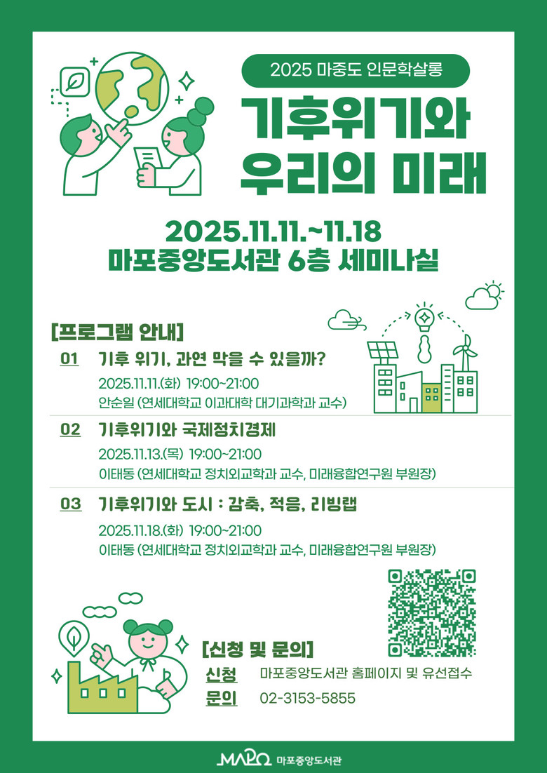 한편 마포중앙도서관에서는 같은 달 11월 11일부터 18일까지 ‘기후 위기와 우리의 미래’를 주제로 ‘하반기 마중도 인문학 살롱’을 운영한다.