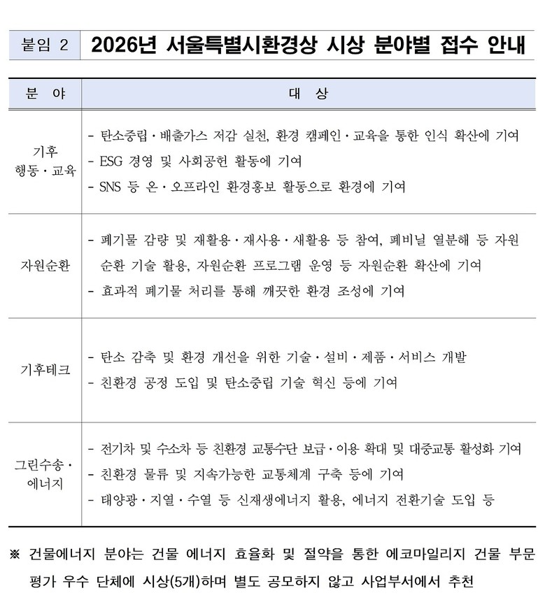 「2026년 서울특별시 환경상」은 기후행동·교육, 자원순환, 기후테크, 그린수송·에너지, 건물에너지 총 5개 분야에서 대상 1명, 최우수상 5명, 우수상 15명 등 총 21명(시민, 단체, 기업)을 선정해 시상할 계획이다.