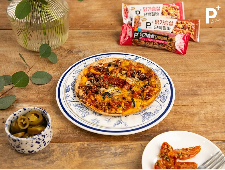 통밀로 만든 또띠아 위에 몸에 좋은 베리와 견과류가 들어간 ‘피플러스 닭가슴살 단백질바’를 고기 대신 얹고, 토마토소스 대신 썬드라이드토마토를 사용하면 칼로리는 낮고 영양가는 높은 담백하고 맛있는 미니 피자를 즐길 수 있다.